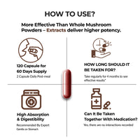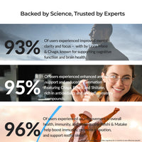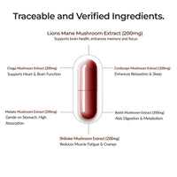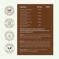 Lion’s Mane Mushroom (8:1 Extract), Chaga Mushroom (4:1 Extract), Maitake Mushroom (5:1 Extract), Shitake Mushroom (5:1 Extract), Cordyceps Mushroom (4:1 Extract) Reishi Mushroom, Capsule Shell.