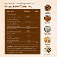 Lion’s Mane Mushroom, Chaga Mushroom, Cordyceps Mushroom, Maca Root Ext, Ashwagandha Root Extract, Natural Caffeine, Rhodiola Rosea Extract , Vitamin 5, Cocoa Powder, Inulin Powder