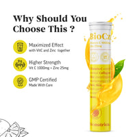 BioCzn fast-acting effervescent tablets with 1000mg of Vitamin C & 25mg of Zinc, antioxidants for skin health, immunity, & energy. Suitable for vegans, GMP certified, promoting overall wellness.