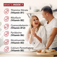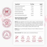 Bulking Agent (Lactose, Microcrystalline Cellulose PH 102), Thiamine Nitrate, Riboflavin, Cyanocobalamin, Pyridoxine, Nicotinamide, Calcium D-Pantothenate, Disintegrant (Sodium Starch Gylcolate), Anti-caking Agent (Colloidal Anhydrous Silica, Magnesium Stearate), Glazing Agent (Colorcoat MB4S-B Clear).