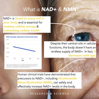 β-NMN that provides NMN, which is is the main precursor of NAD+ and NAD+ is found in every cell in your body and is essential for creating cellular energy & maintaining cellular health. Some clinical trials have demonstrated that Nicotinamide Mono-Nucleotide (NMN), can safely and effectively increase NAD+ levels in the body.