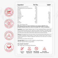 Calcium Carbonate, Magnesium Oxide, Zinc Oxide, Ashwagandha (Withania somnifera) Root Extract, Sage (Salvia officinalis) Leaf Extract, Sodium Starch Glycolate, Crospovidone, Croscarmellose Sodium, Pantothenic Acid, Thiamine Hydrochloride, Pyridoxine Hydrochloride, Folic Acid, Cholecalciferol, Vitamin B12, Hypromellose, Red Iron Oxide, Microcrystalline Cellulose, Magnesium Stearate, Daidzein & Genistein.